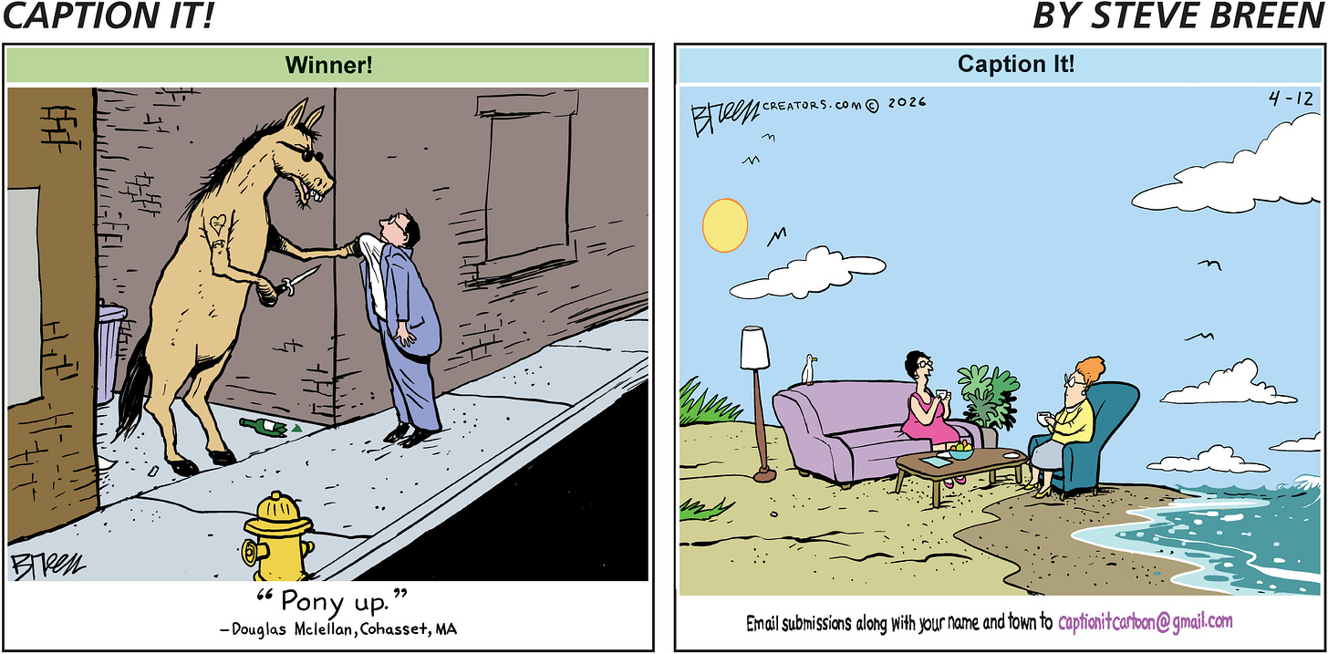 Cartoon Caption ContestSteve BreenMar 10, 20266ShareFinalists“Don’t you wish you were in my shoes?”Scott Malcolm, Salt Lake City, UT“ Your wager was for me to place at Pimlico. I delivered and I want my take.”Kelly Seabold, Toledo, OHPreviousNext